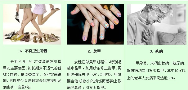 2、传染性强、易感染:由于灰指甲具有传染性,给家人和朋友也带来了威胁,并且会引起其他皮肤癣,如手足癣、体股癣;女同志患灰指甲有95%可传染成霉菌性、念珠球菌性等严重妇科疾病。